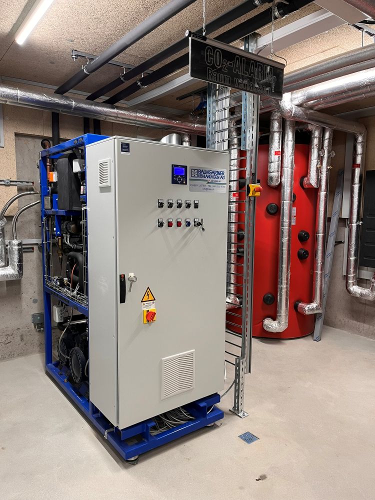 Die Kälteerzeugung wird durch unseren SWISSLINE CO2 Minibooster gewährleistet. Dieser erzeugt nicht nur die Kälte für die Kühl- & Tiefkühlmöbel sowie die Kühl-/Tiefkühlzellen, sondern auch für die Klimageräte. Somit wird die gesamte Kälte- und Klimatechnik mit dem umweltfreundlichen Kältemittel CO2 betrieben. Zudem haben der Volg Laden, die Drogerie und die Lagerräumlichkeiten kein separates Heizsystem. Diese Räumlichkeiten werden ebenfalls über die CO2 Kälteanlage, welche über ein Wärmepumpen-Modul verfügt, beheizt.
